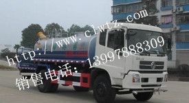 灑水車前沖(噴)后灑,帶側噴,罐體后帶工作平臺,平臺上安裝綠化灑水炮,灑水炮可全方位旋轉,可連續調成直沖狀、大雨、小雨、毛毛雨,帶安全護欄,配備全國質量評比第一名的杭州威龍大功率專用灑水泵,泵可自吸自排,安裝過濾網,帶消防接口,可通過消防栓進水,帶自流閥,隨車選裝20米綠化卷盤,可噴灑農藥,罐體金屬漆。