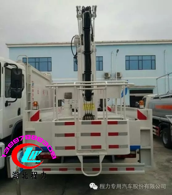程力高空作業部分配置:整車由工作臂(三節臂,上臂下臂采用雙舉升液壓油缸,小臂采用單舉升液壓油缸)、H型支腿(共4條,采用汽車吊支腿工藝,前后面支腿可縱向和垂直地面伸出)、支腿雙向液壓鎖(保證支腿放下后不會自行收縮)、取力器裝置、副梁底架(保證整車受力均勻,堅固可靠)、回轉機構(由轉臺/擺線馬達/行星減速器/回轉支承/小齒輪組成)、中心旋轉接頭、液壓系統總成(保證在較大載荷時液壓系統無殘漏,油溫正常,密封性好,微動性強,連續升降運行平穩,作業人員更具安全舒適感)、上中下3組操作閥(支腿操縱閥/車上操縱閥/工作斗內操縱閥)、應急開關(保證作業人員在高空時能安全返回地面)、全鋼工作斗、示寬燈等、主臂帶起重吊鉤等部件組成。