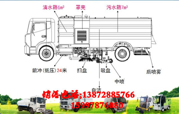 洗掃車水箱容積大,采用的是高壓水泵,掃路時先用水對路面進行高壓沖洗,再頑固的垃圾都能直接沖起來,再吸掃收集垃圾,以達到更好的清掃效果,更簡單的說就是,洗掃車比掃路車多加裝一個高壓水泵,加大了水箱容積,加大了副發動機馬力,【天錦掃路車副發動機采用康明斯140馬力,天錦洗掃車副發動機采用康明斯170馬力】掃路車洗掃車都可加裝沖前,后灑,高射炮,霧炮機,前噴霧,后噴霧,伸縮圈盤,雪鏟,雪輥,