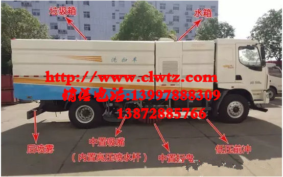 洗掃車結合了掃路車和高壓清洗車的功能,一般標配兩個中置掃刷,中置超寬吸嘴(內置高壓噴水桿)。洗掃車在作業時由高壓噴水桿噴出高壓水流,可沖起路面頑固附著物,由吸嘴連同水和垃圾一起吸進垃圾箱。由于洗掃車在作業過程中耗水量較大,所以水箱比較大,因此洗掃車都由軸距在3800以上底盤改裝而成。