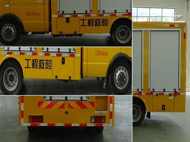 整車備注:ABS型號:3550B500;ABS生產企業:浙江亞太機電股份有限公司;所用材料材質、連接方式以及后部防護裝置的主要尺寸參數(斷面尺寸和離地高度):防護材料:Q235A,側后防護由車身結構代替,后防護下邊緣離地高420mm;車廂頂部封閉且不可開啟;專用功能及裝置:該車型加裝箱體、電焊機,電鎬,發電機,空壓機等專用裝置用于工程救險;